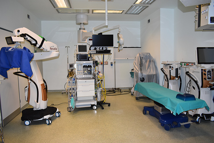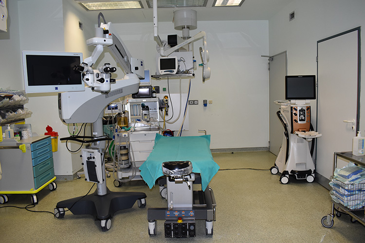 Η Κλινική διαθέτει 2 χειρουργικές αίθουσες και μία αίθουσα μικροεπεμβάσεων, όπου διενεργούνται καθημερινά επεμβάσεις καταρράκτη, μεταμοσχεύσεις κερατοειδούς, υαλοειδεκτομές (για αποκολλήσεις αμφιβληστροειδούς, οπή ωχράς κηλίδας, επιαμφιβληστροειδική μεμβράνη, ενδοϋαλοειδική αιμορραγία), αντιγλαυκωματικές επεμβάσεις, λοιπές επεμβάσεις προσθίου ημιμορίου (πτερύγια), μικροεπεμβάσεις βλεφάρων (χαλάζια, θηλώματα, κύστεις) και ενδοϋαλοειδικές εγχύσεις.